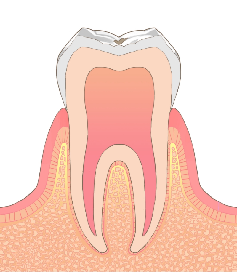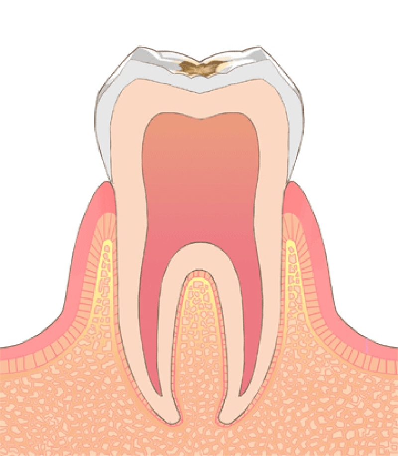 ⻭の一番表面にあるエナメル質が白く濁った状態です。溝の部分が茶色っぽくなることもありますが、見た目にはほとんど変化がありません。