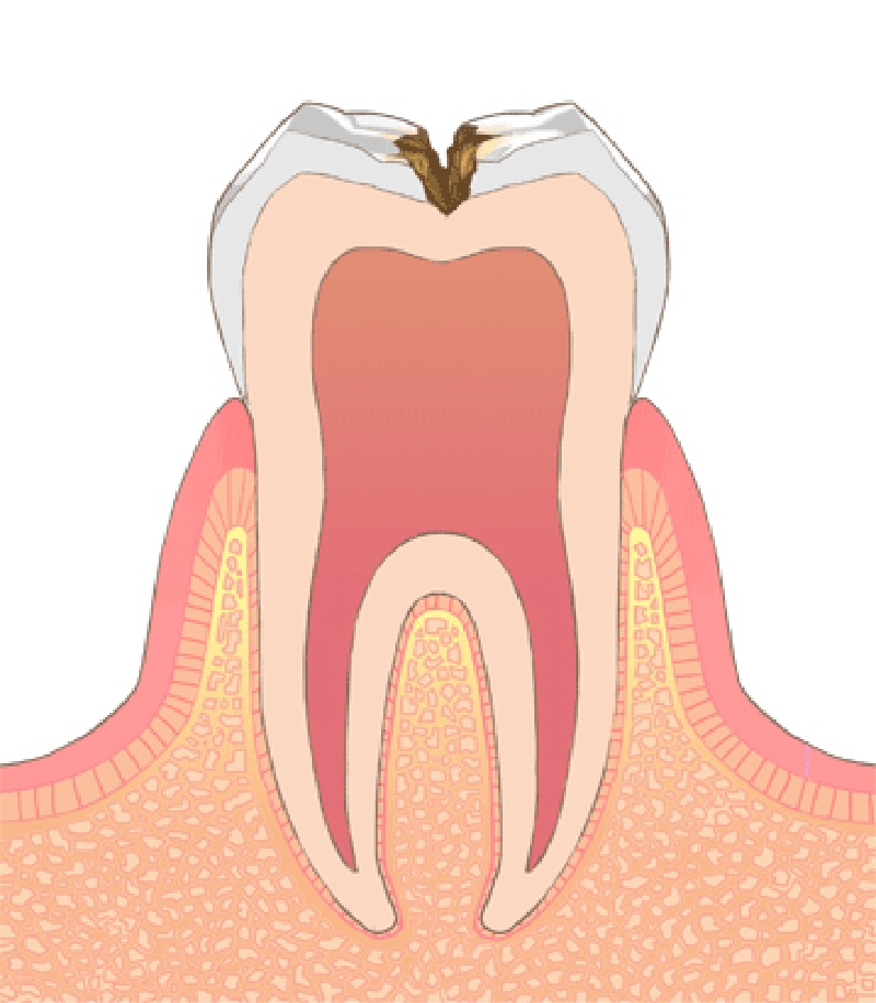 エナメル質のさらに奥にある象牙質まで細菌が進行した状態です。象牙質はエナメル質に比べると柔らかいため、一気にむし⻭は拡大します。⻭髄(神経)の近くにまで進行していると、冷たい水や甘いお菓子、温かい食事がしみるようになります。