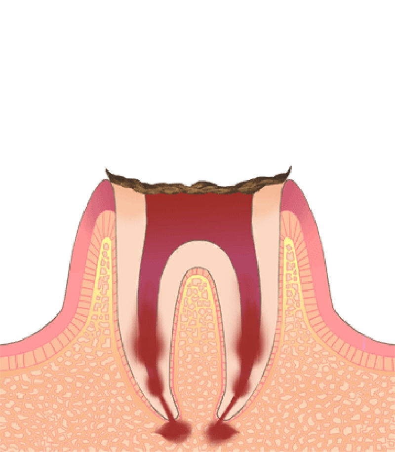 ⻭髄炎を放置すると、どこかの段階で痛みは消失します。これは細菌によって⻭の神経が失われたためです。しかし、治ったわけではないので、放置していると根の先に炎症が起こります。最悪のケースでは顎の骨にまで細菌が感染するケースもあります。
