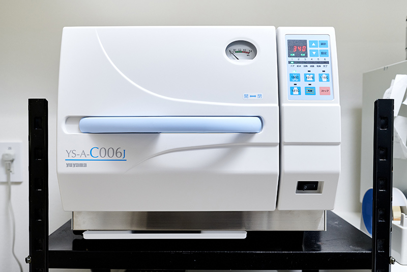 器具の滅菌治療に使用した器具は、オートクレーブで滅菌します。密閉庫内で高温高圧の蒸気を吹き付けるので、形状が細かい器具でもすみずみまで滅菌可能です。その後は滅菌パックで保管するので雑菌が付着しません。