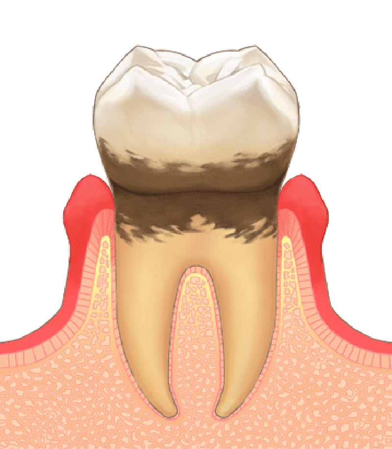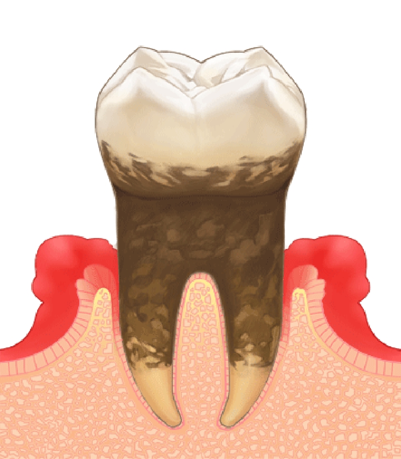 ⻭槽骨や⻭根膜にも悪影響を及ぼし、はっきりとした自覚症状のある状態です。⻭がグラグラと動くようになったり、⻭肉退縮によって⻭が⻑く見えるようになったりすることがあります。